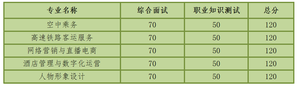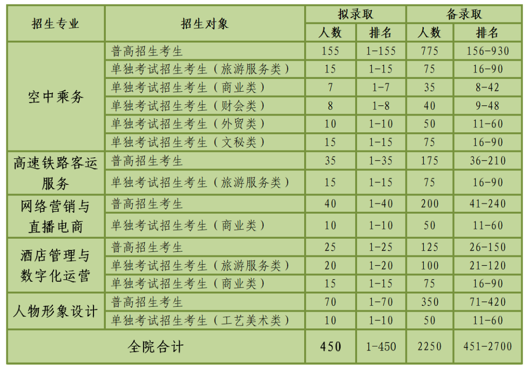 空中乘务、高速铁路客运服务专业的考生在综合测评体检初检合格的前提下,学院按综合成绩总分和各类别招生计划,分“拟录取”、“备录取”和“未录取”确定各考生录取情况。进入“拟录取”和“备录取”的考生必须是体检初检合格且完成该专业全部测评项目(综合面试和职业知识测试)。