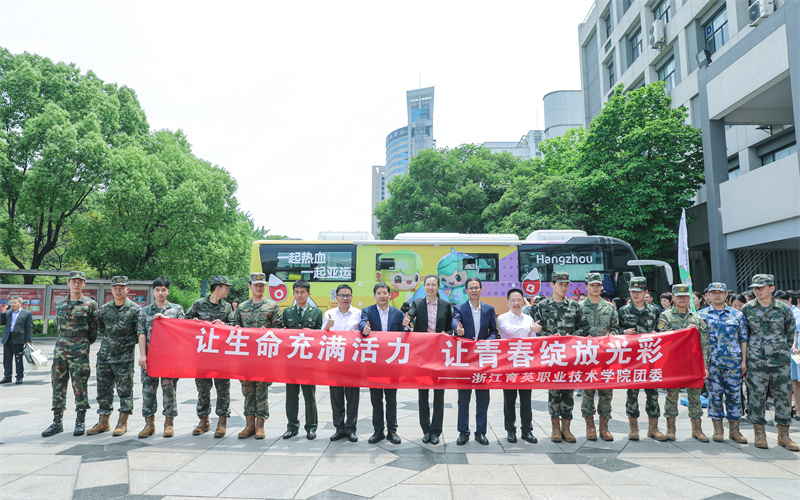 浙江育英职业技术学院青年志愿者代表带领青年志愿者们共同发起“迎亚运热血先锋在行动”的倡议。