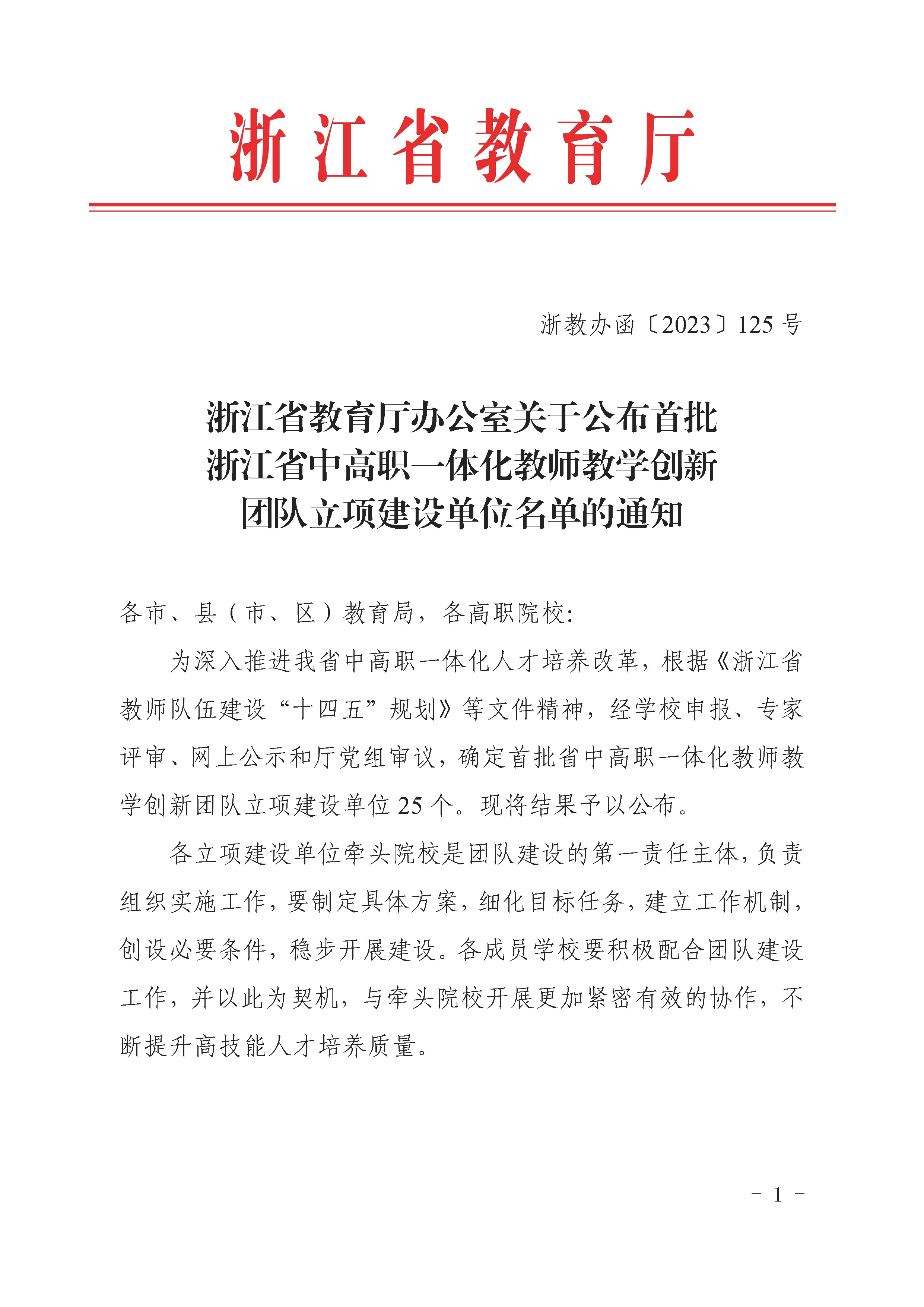浙江省中高职一体化教师教学创新团队建设工作旨在深入推进我省中高职一体化人才培养改革,通过教师教学创新团队提升中高职师资合作紧密程度,建立中高职师资有效协同工作机制,推进构建纵向贯通横向融通的现代职业教育体系。