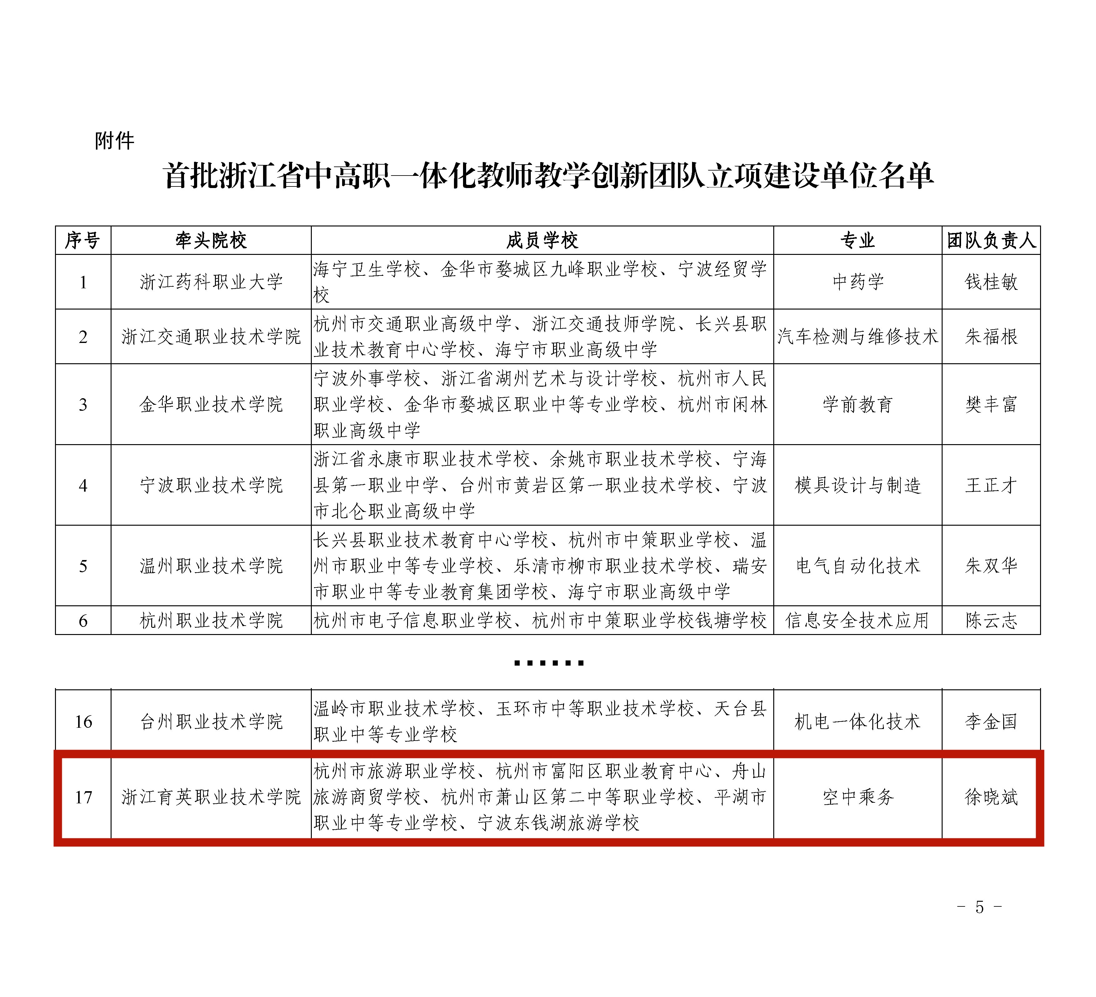 近日,浙江省教育厅印发通知,确定首批浙江省中高职一体化教师教学创新团队立项建设单位25个。由浙江职业技术学院党委委员、副校长、民航交通学院院长、空中乘务专业负责人徐晓斌教授领衔,联合多所中职学校与航空公司组建的空中乘务专业中高职一体化教师教学创新团队获批立项。